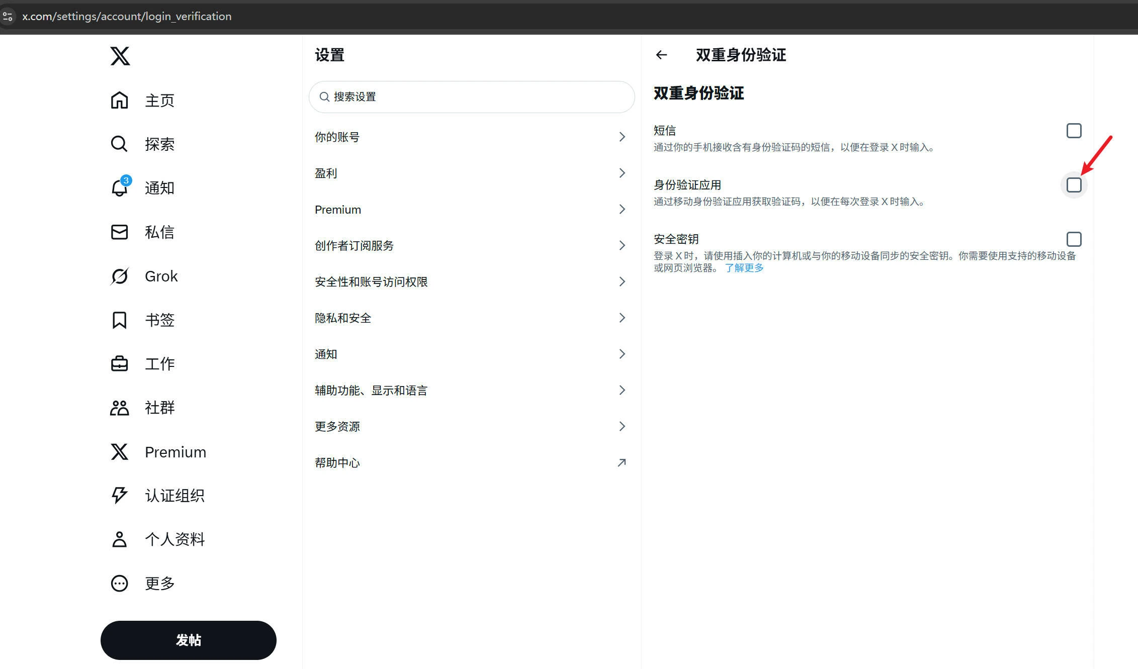 1. 网页登录 x.com,打开设置和隐私->安全->双重身份验证->身份验证应用,会生成一个二维码让您扫描。